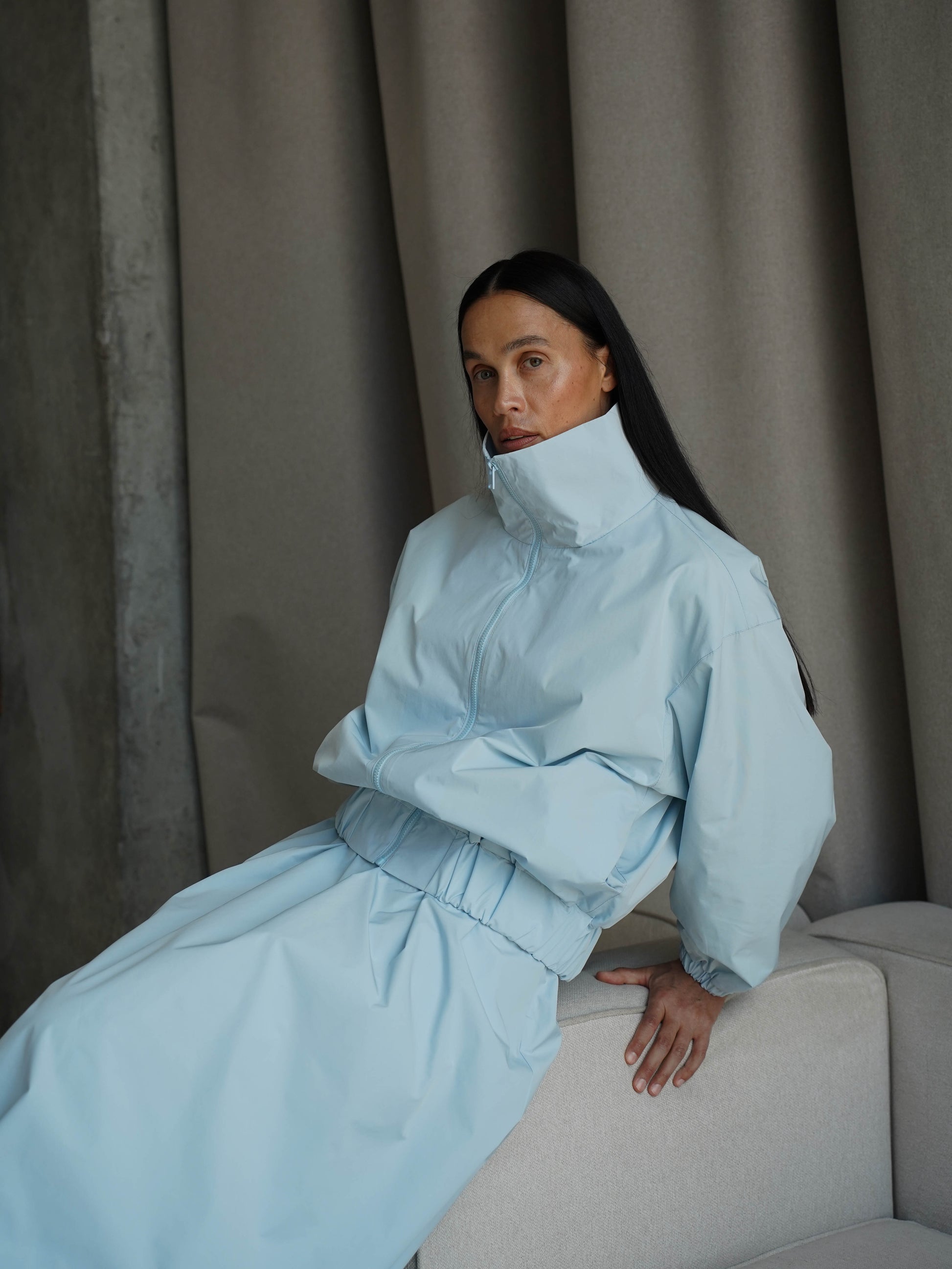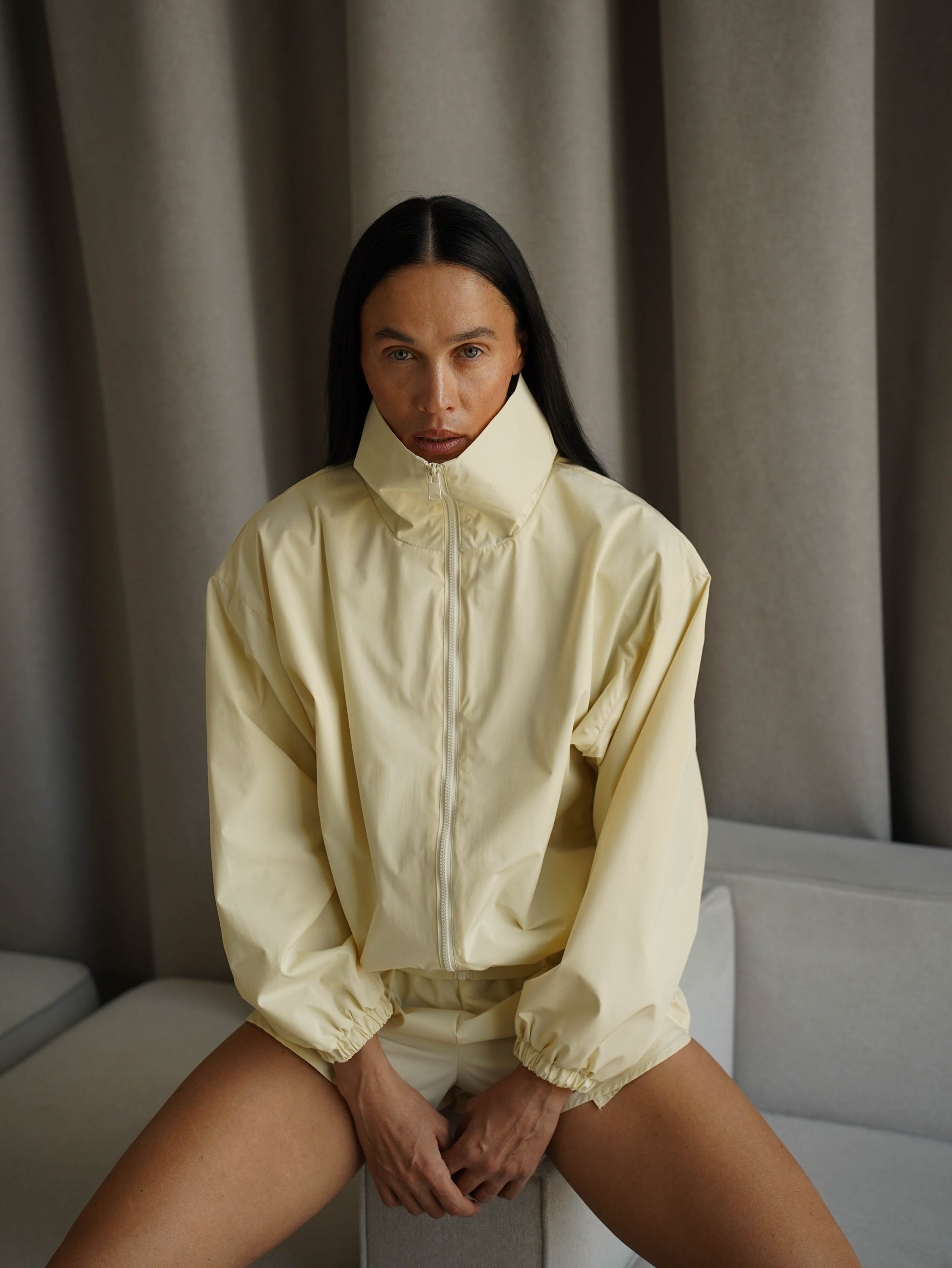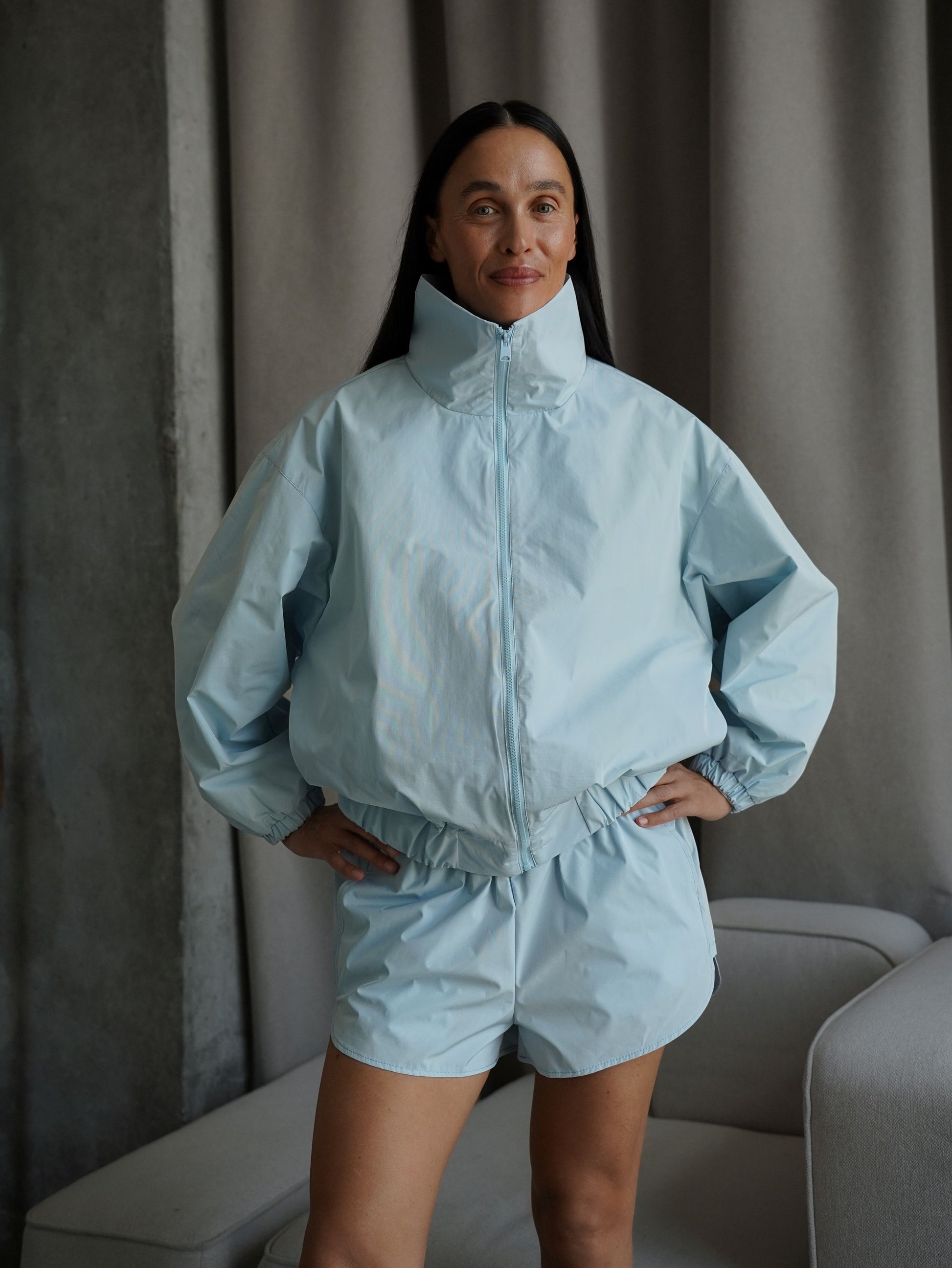 Мастерка з плащової тканини поєднує комфорт, практичність і стиль. Вона має дві функціональні кишені. Резинка знизу допомагає підлаштувати посадку та силует під себе, а манжети на рукавах забезпечують зручність у носінні. Високий комір-стійка не лише стильно виглядає, але й захищає від вітру, а застібка в тон виробу завершує продуманий дизайн. Доступна в блакитному та жовтому кольорах.