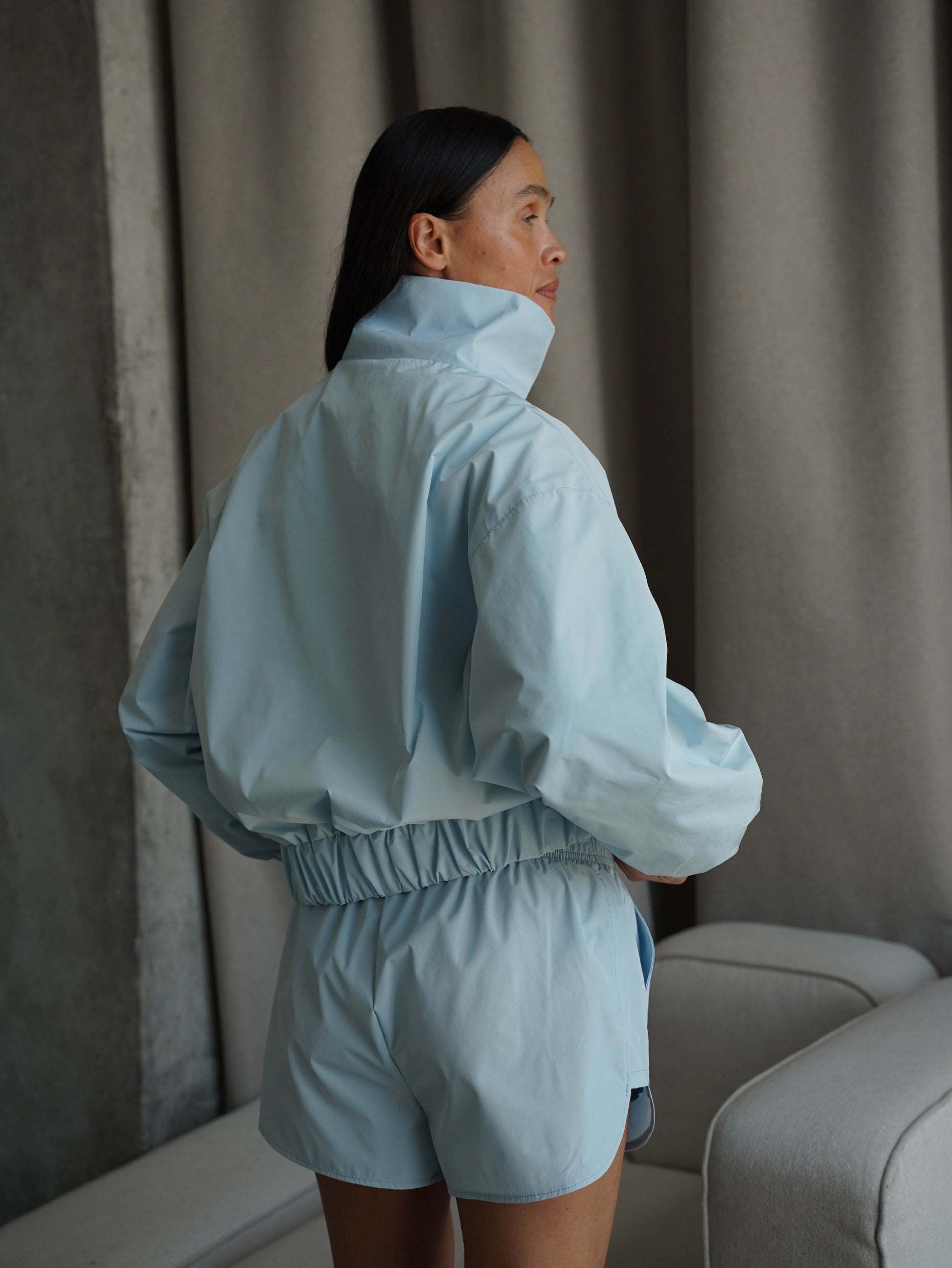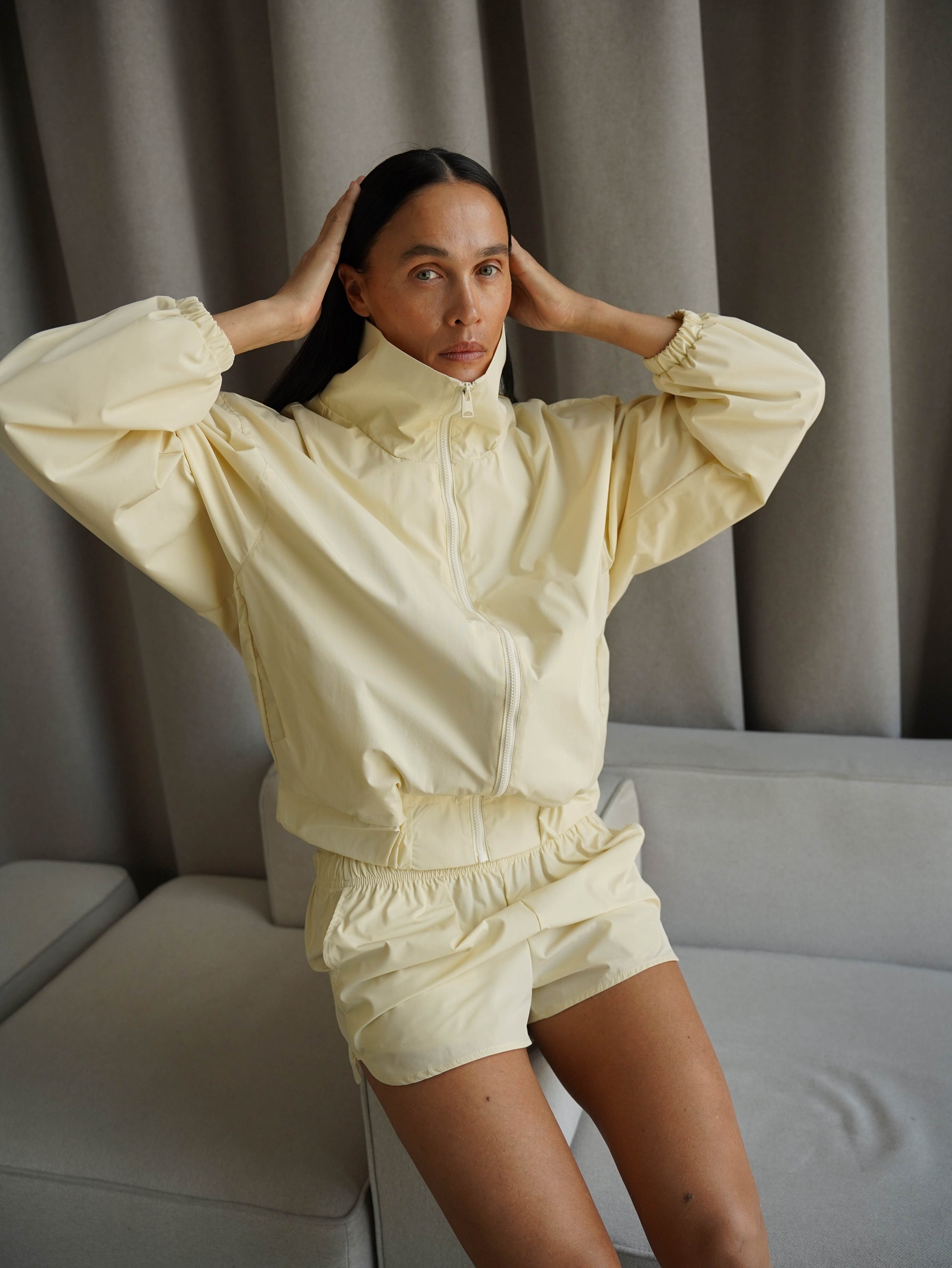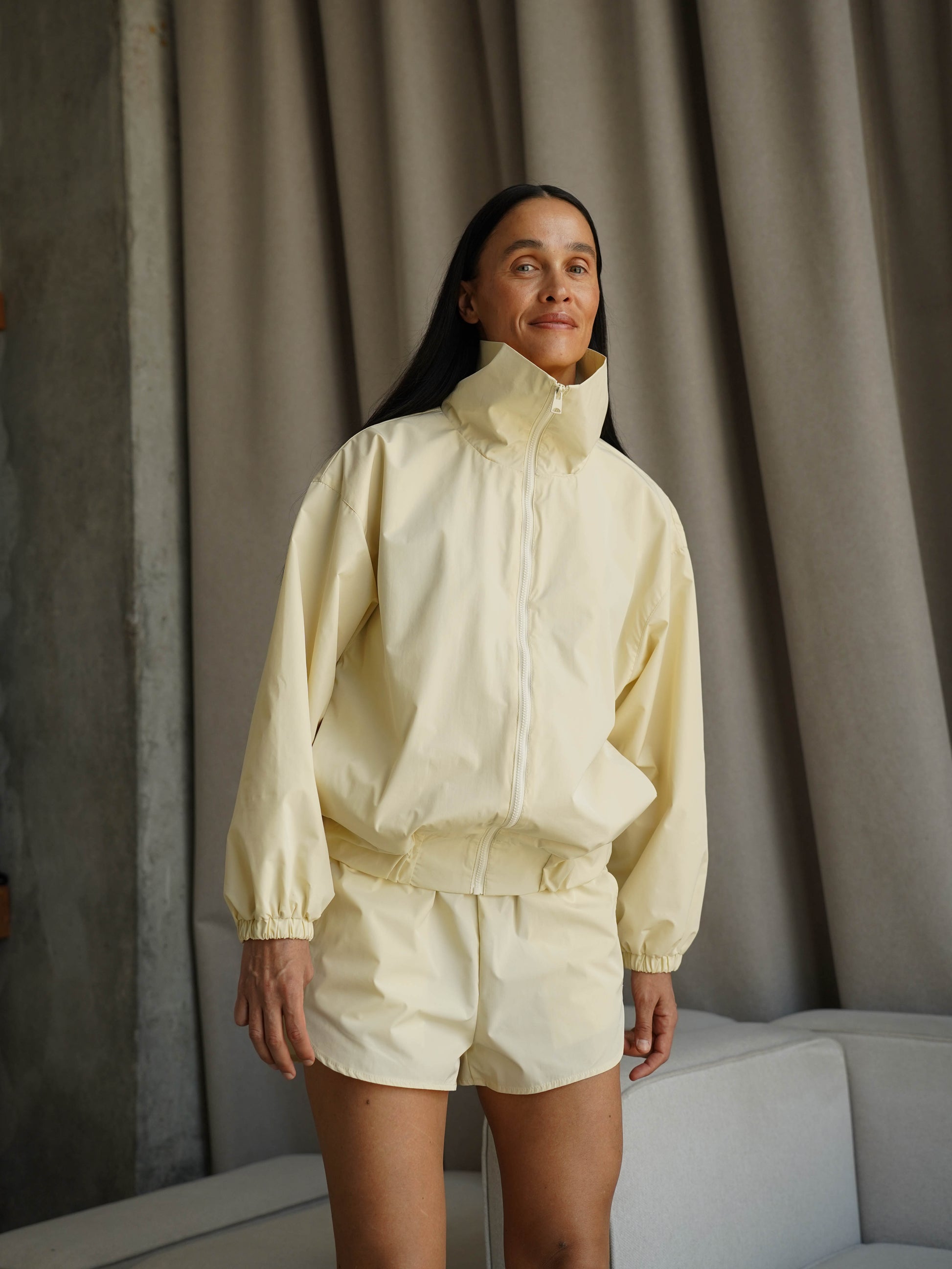 Мастерка з плащової тканини поєднує комфорт, практичність і стиль. Вона має дві функціональні кишені. Резинка знизу допомагає підлаштувати посадку та силует під себе, а манжети на рукавах забезпечують зручність у носінні. Високий комір-стійка не лише стильно виглядає, але й захищає від вітру, а застібка в тон виробу завершує продуманий дизайн. Доступна в блакитному та жовтому кольорах.