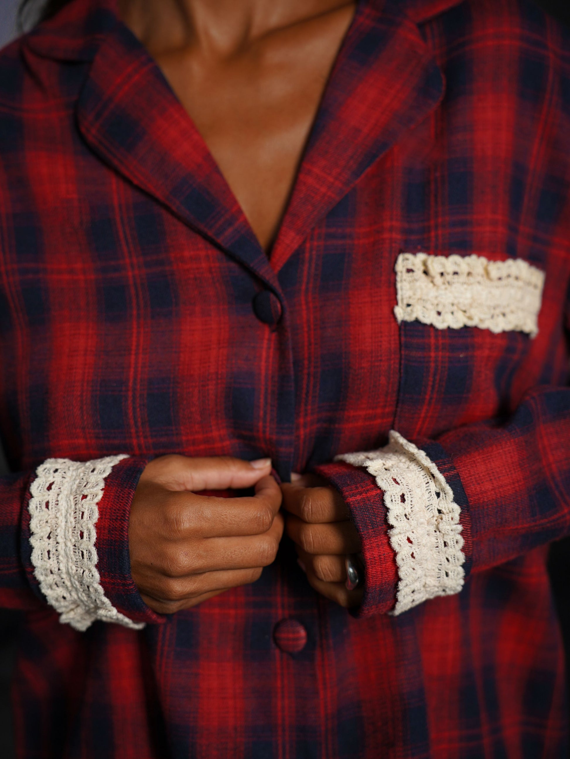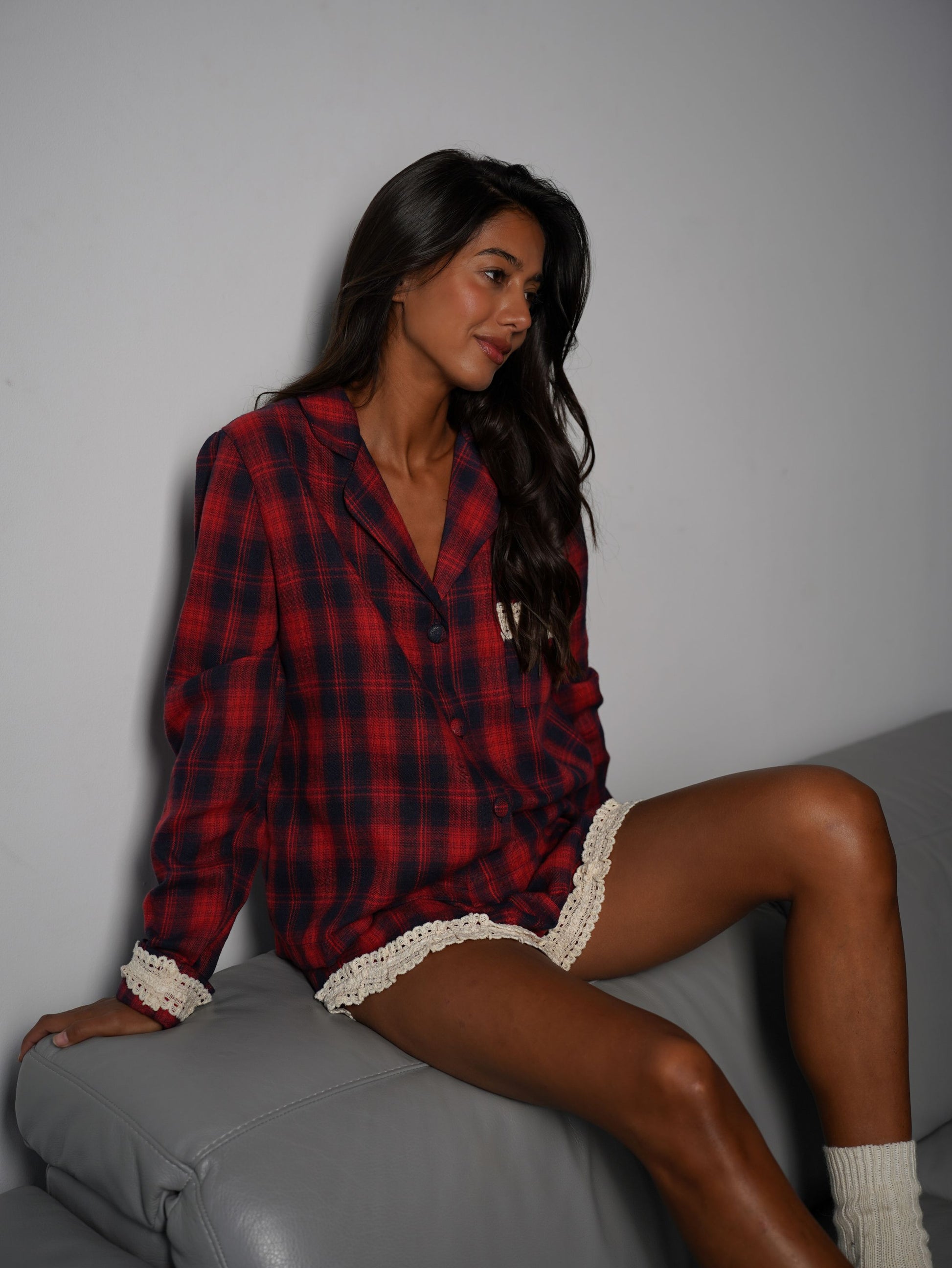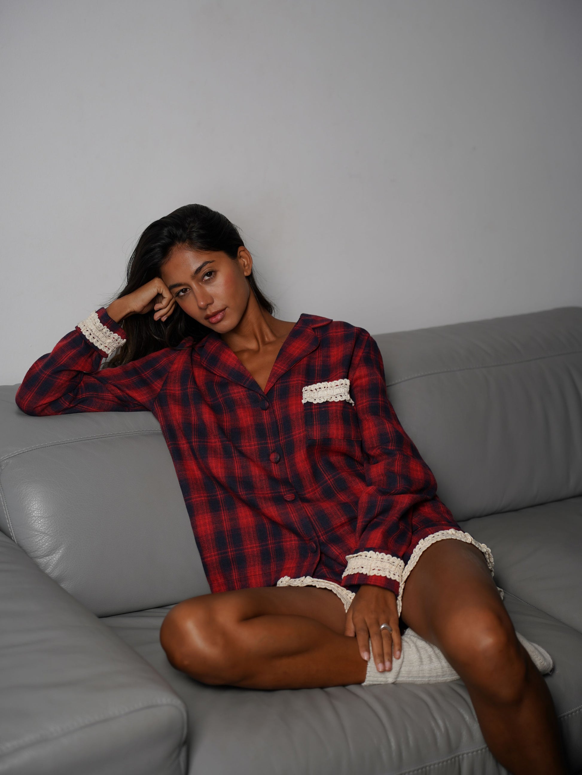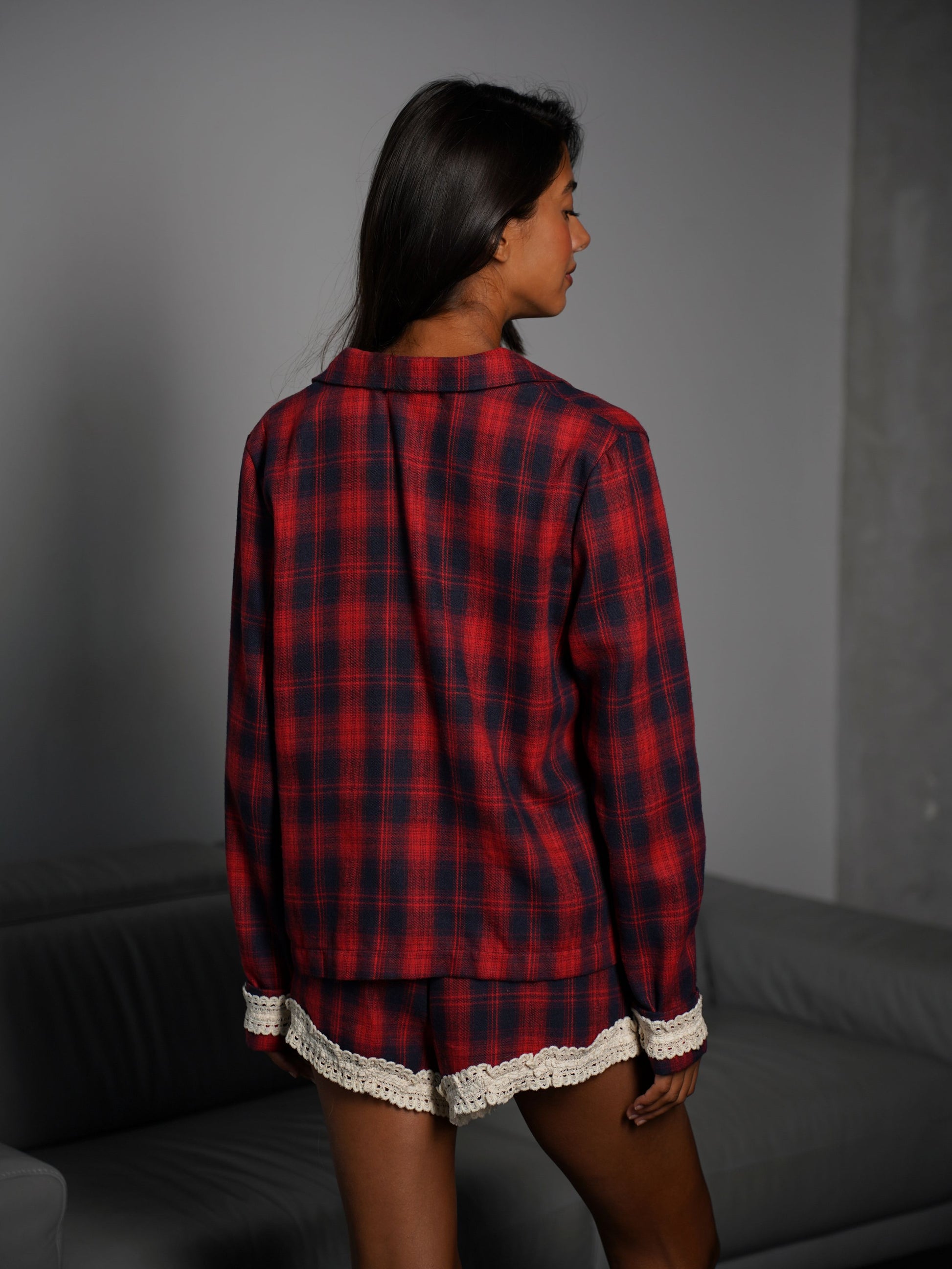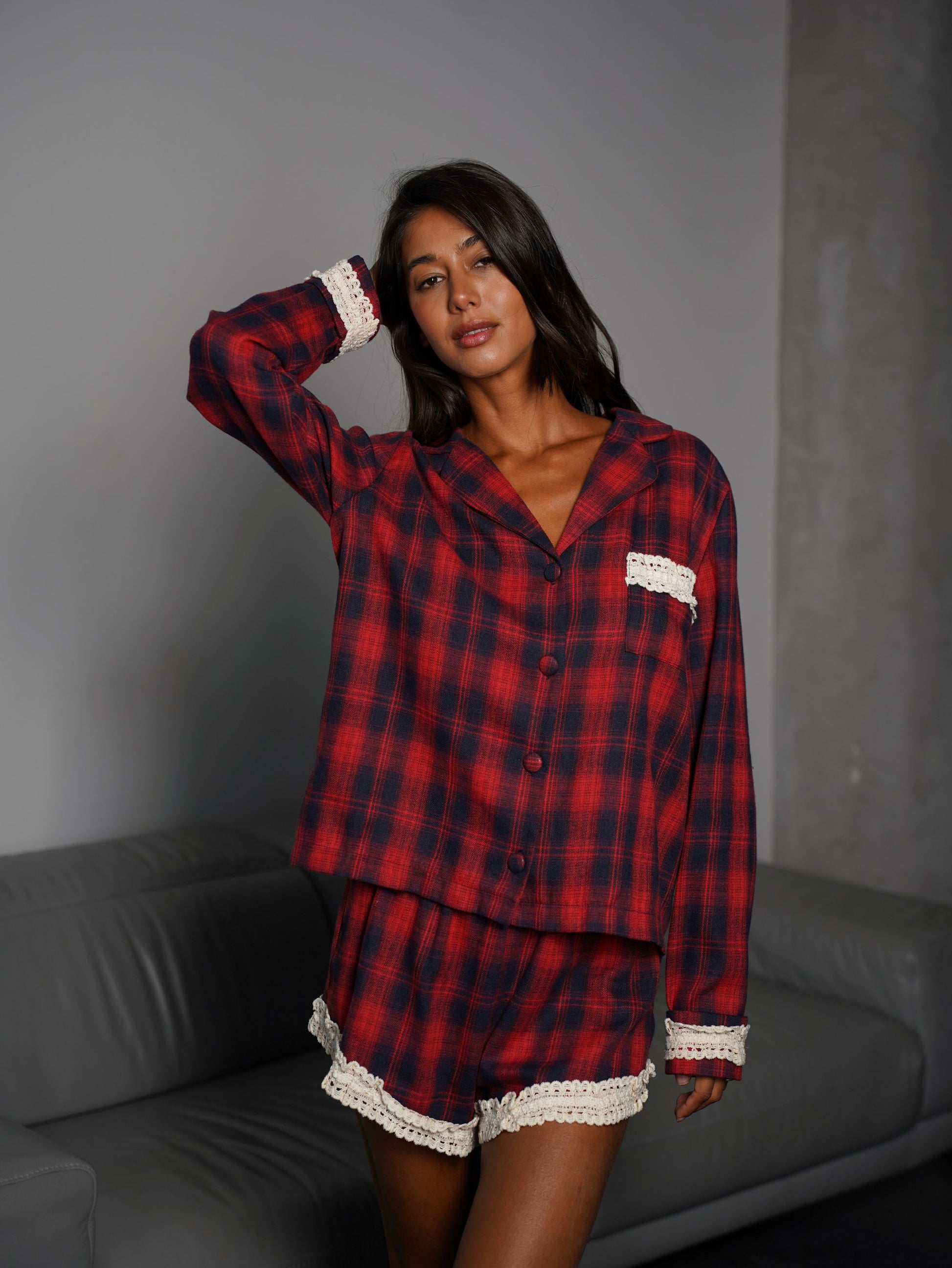 Фланелева піжама у клітинку створена для тих, хто цінує комфорт і стиль навіть вдома. В комплекті йде сорочка з довгим рукавом та шорти, оздоблені мереживом.
