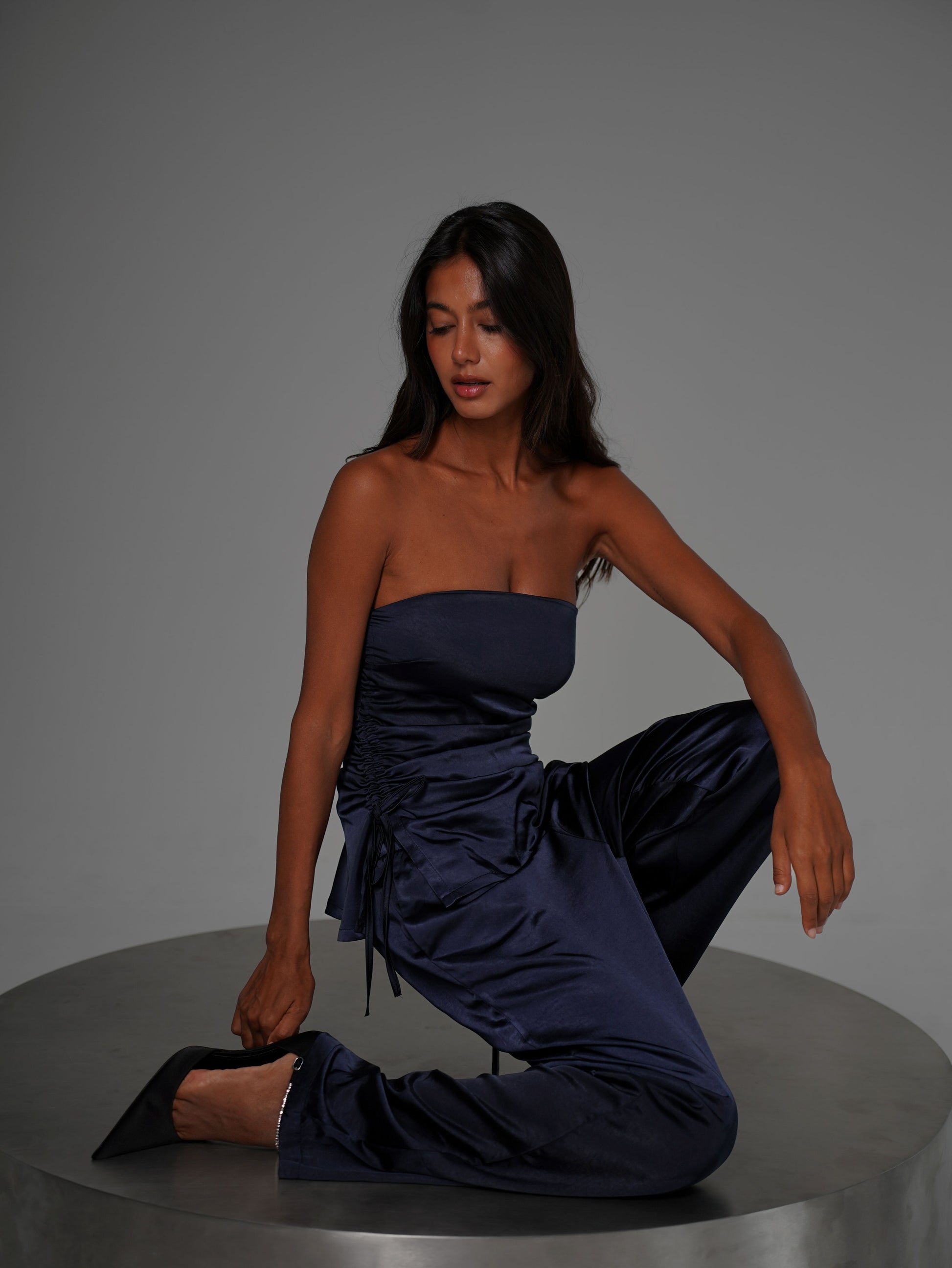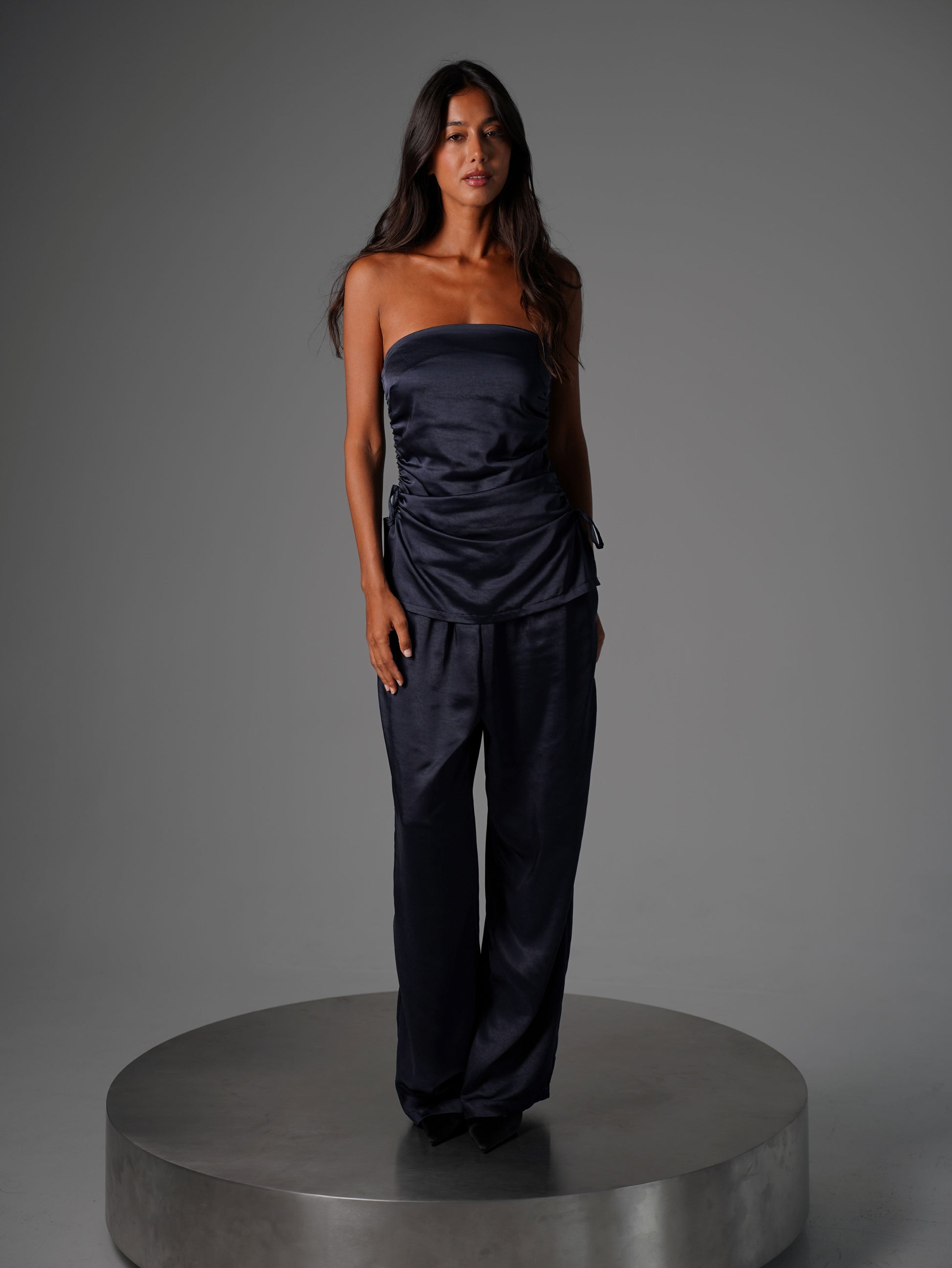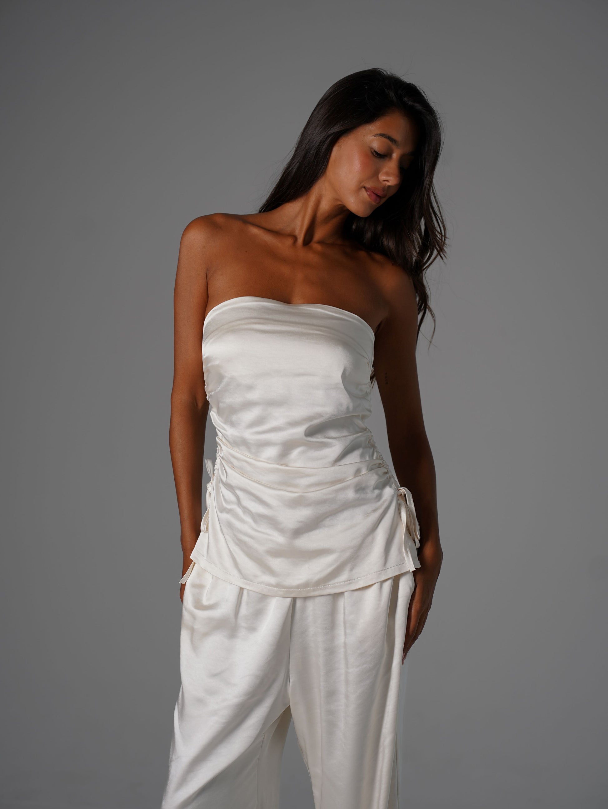 Ідеальний образ для особливих моментів - сатиновий костюм у двох універсальних кольорах: молочному та темно-синьому. Завдяки боковим затяжкам топ підлаштовується під вашу фігуру та робить акцент на талії. Штани є ідеальним доповненням та візуально подовжують силует.