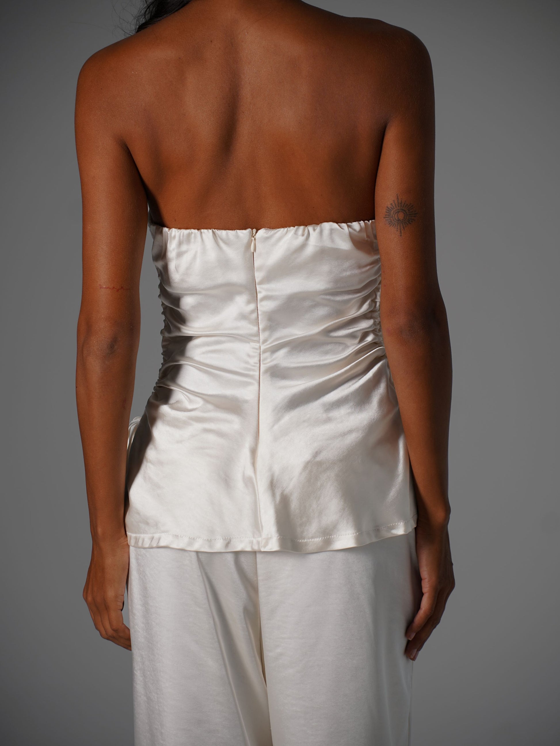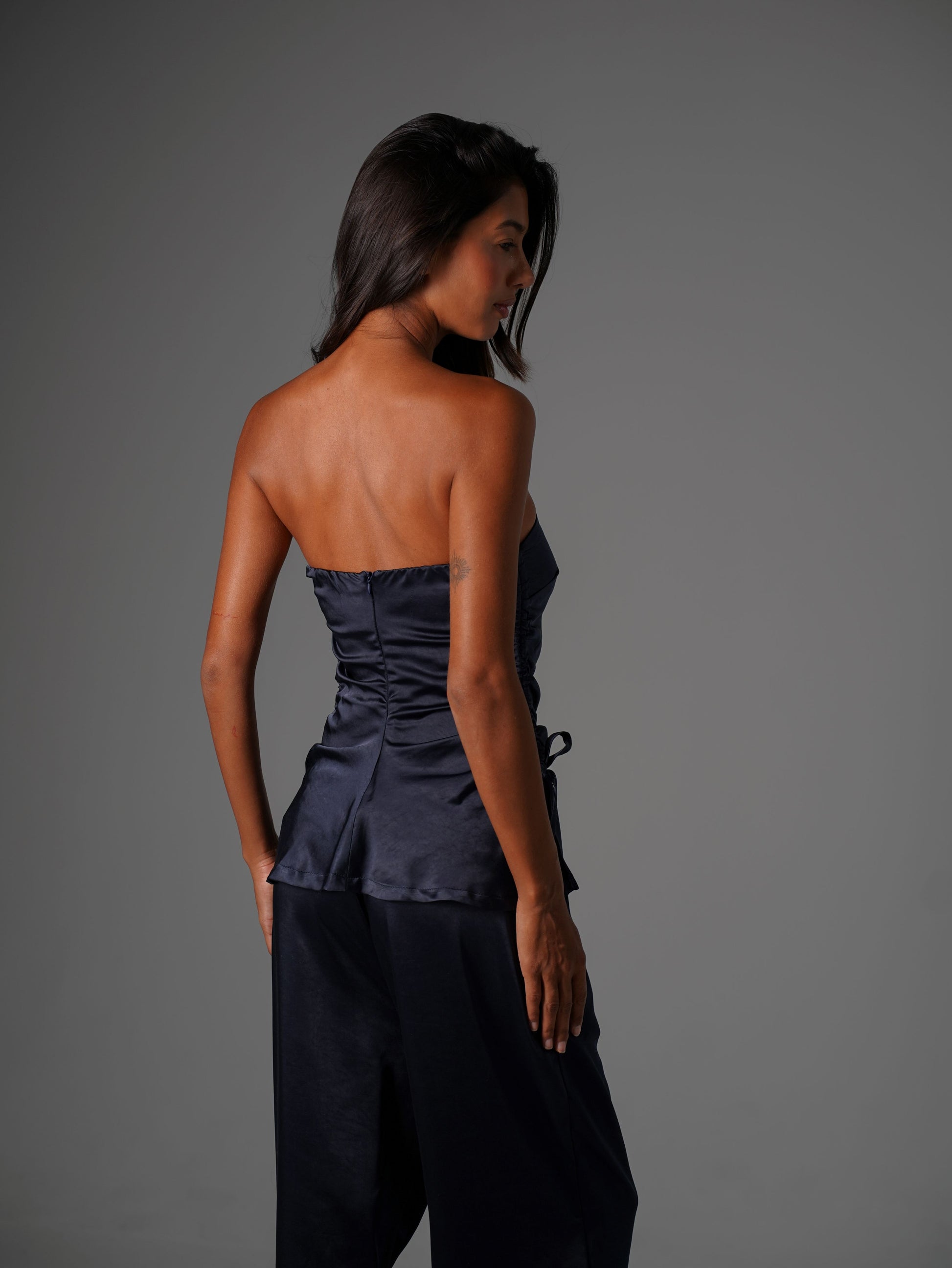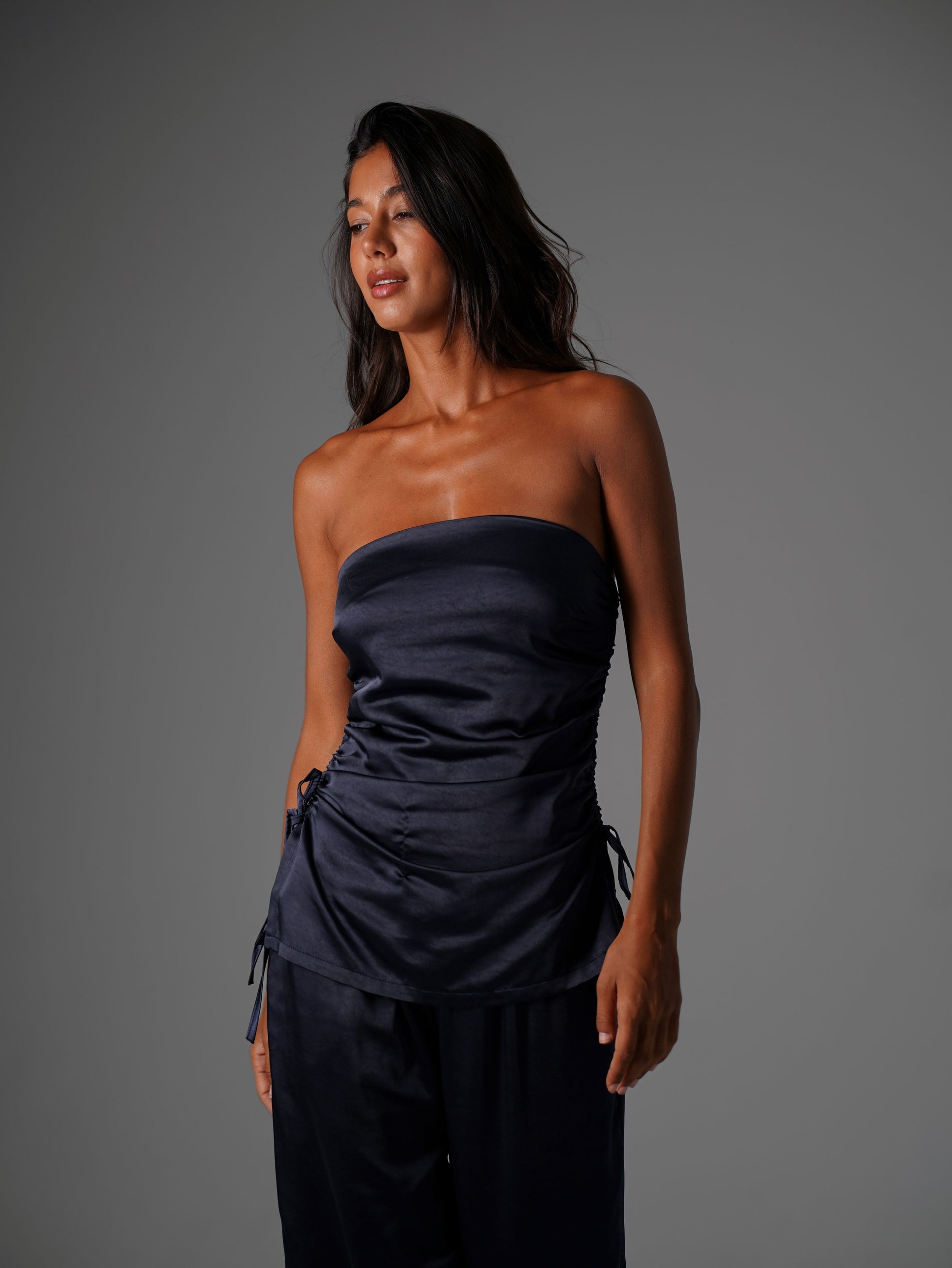Ідеальний образ для особливих моментів - сатиновий костюм у двох універсальних кольорах: молочному та темно-синьому. Завдяки боковим затяжкам топ підлаштовується під вашу фігуру та робить акцент на талії. Штани є ідеальним доповненням та візуально подовжують силует.