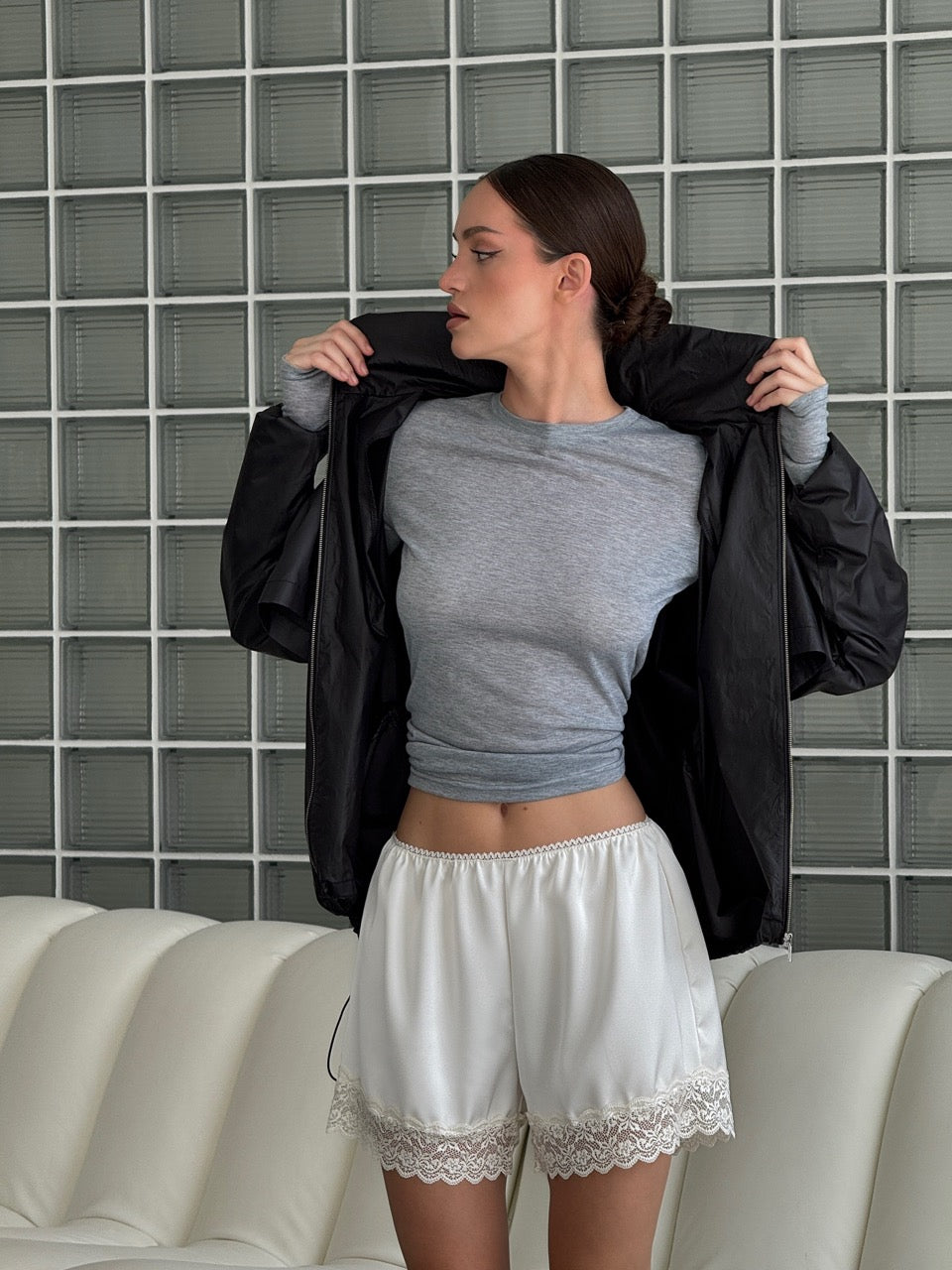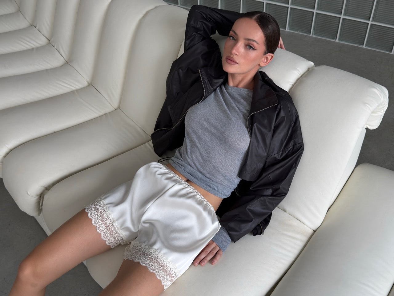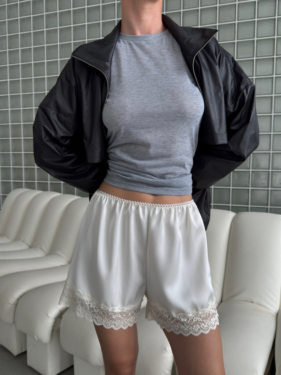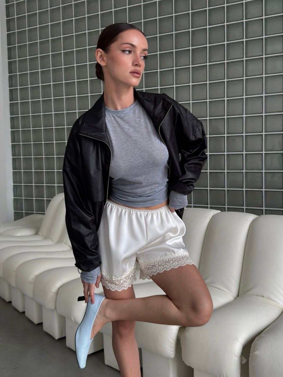 Шорти виконані з сатину в молочному кольорі, що дарує відчуття легкості та комфорту. Вільний крій забезпечує зручність у носінні, а делікатна мереживна обробка по низу додає жіночності та витонченості. Ідеальний вибір для стильних і трендових образів на цю осінь, щоб носити зі светрами, мастеркою і навіть під пальто.