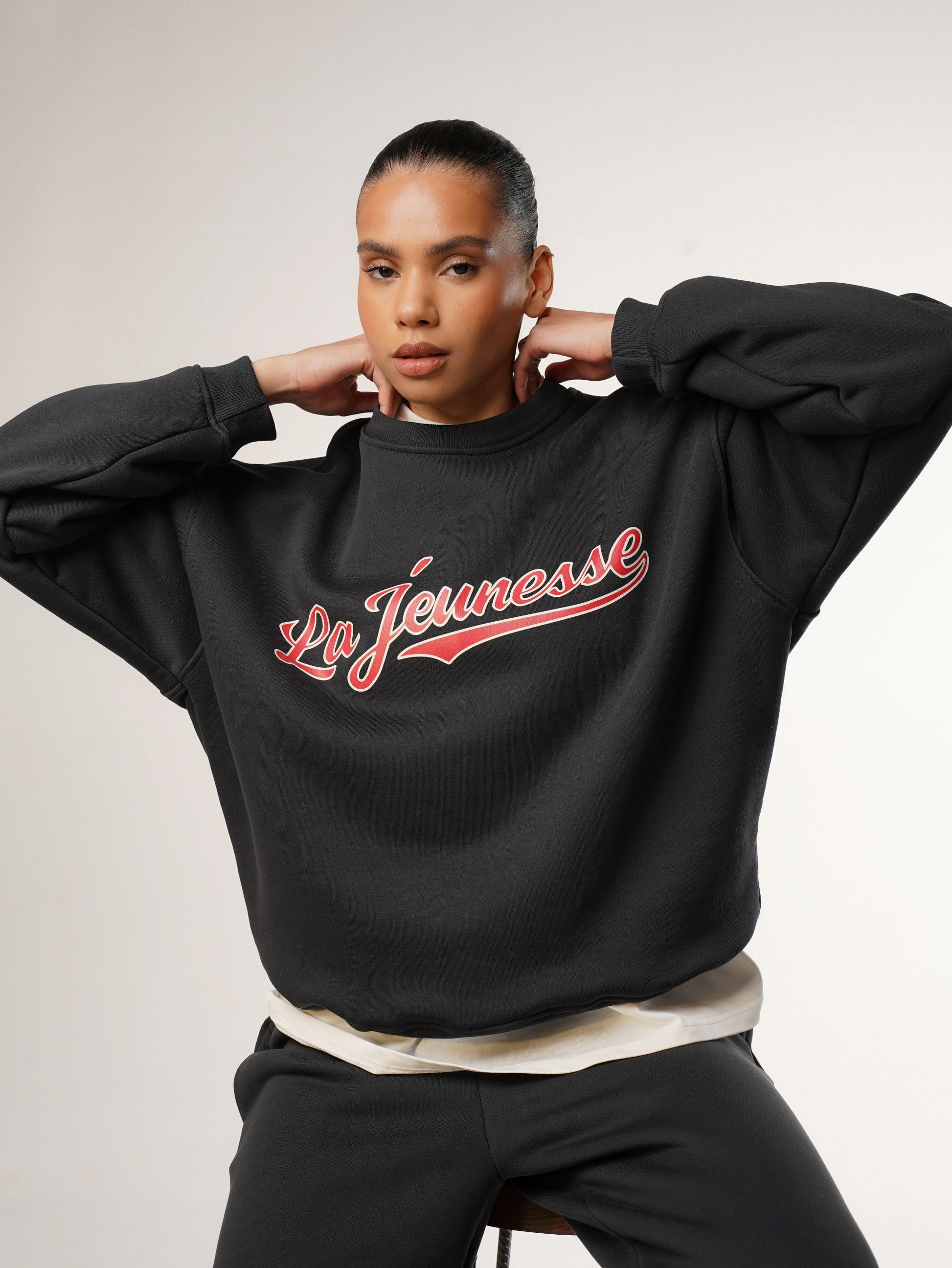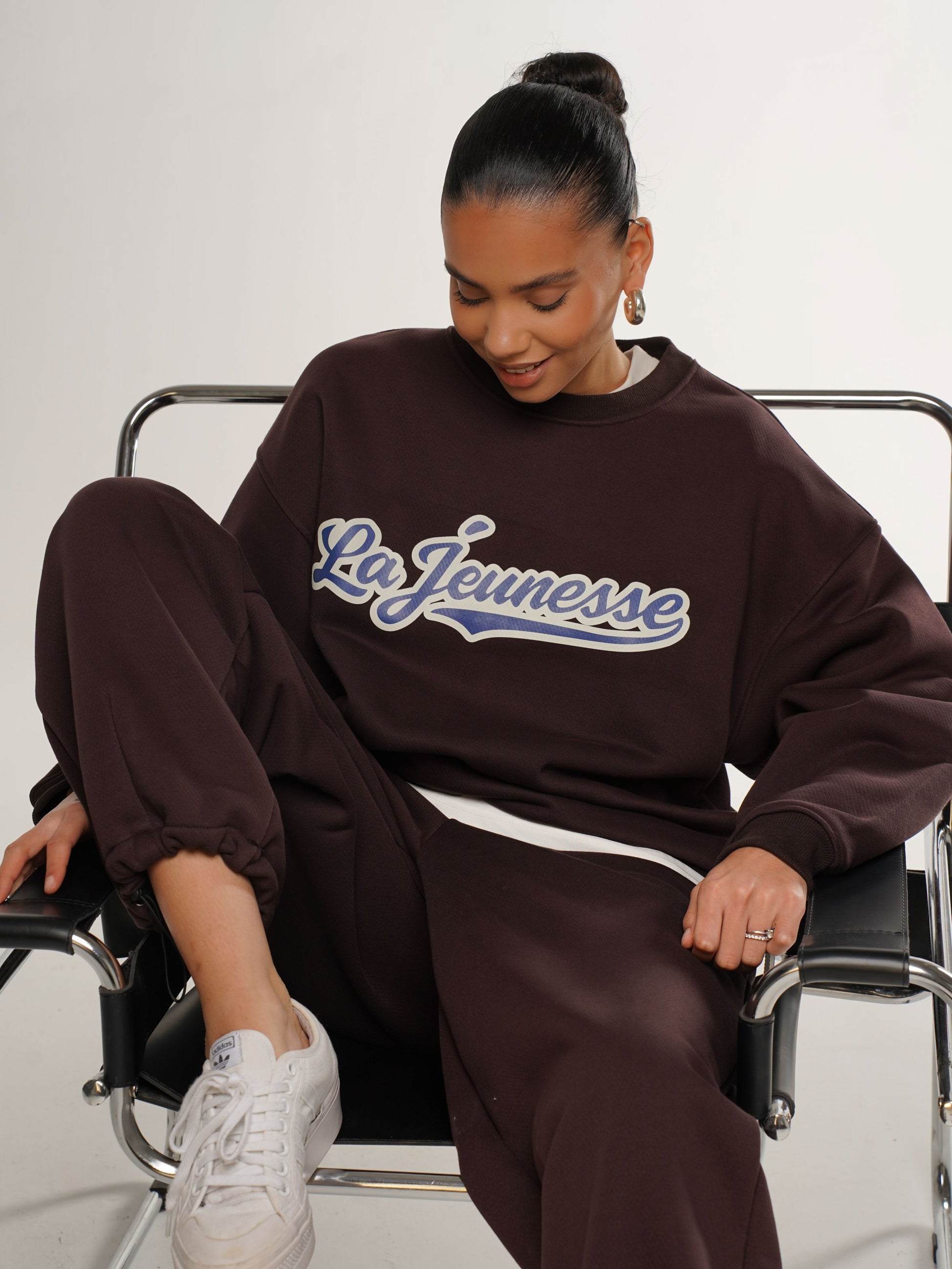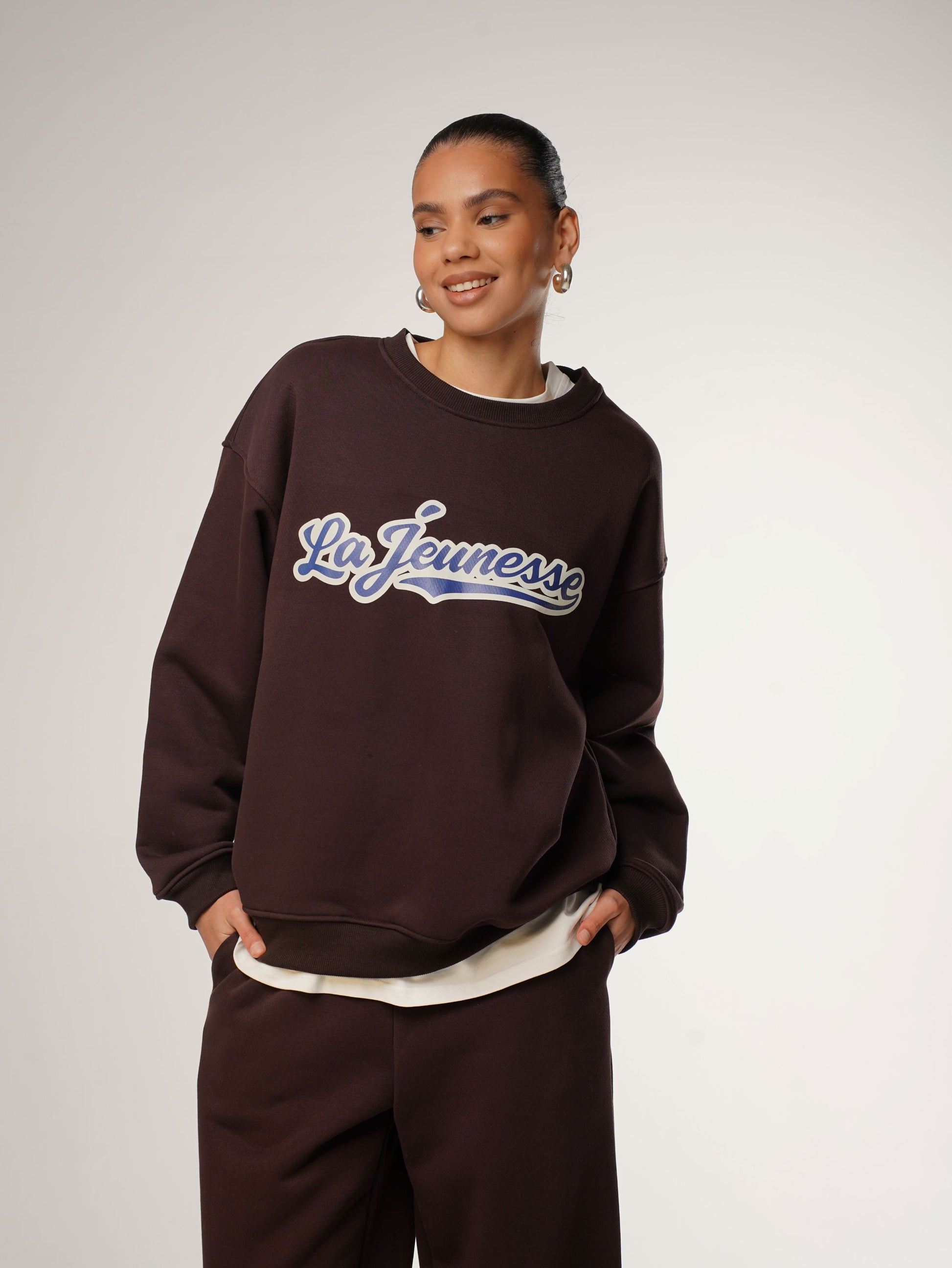 Світшот із принтом «La Jeunesse» (в перекладі з французької «молодість») у коричневому та графітовому кольорах створений для тих, хто цінує комфорт і мінімалістичний стиль. Вільний крій, спущена лінія плеча та щільна тканина роблять його незамінним на кожен день.