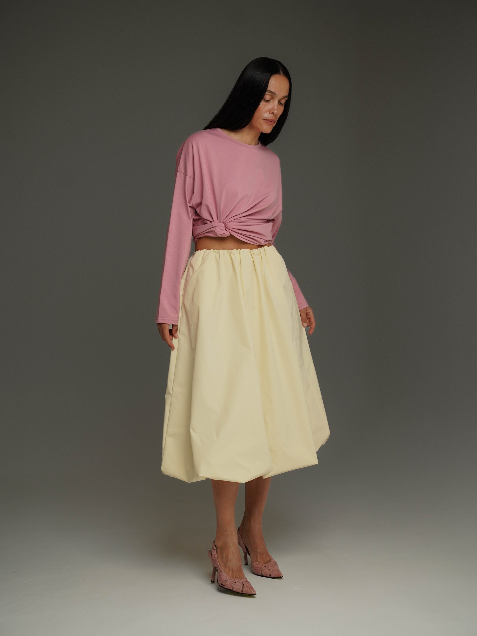 Завдяки об’ємному та виразному крою спідниця-балон миттєво стає центром образу. Навіть базові футболки, топи або лонгсліви виглядають стильно в її компанії.