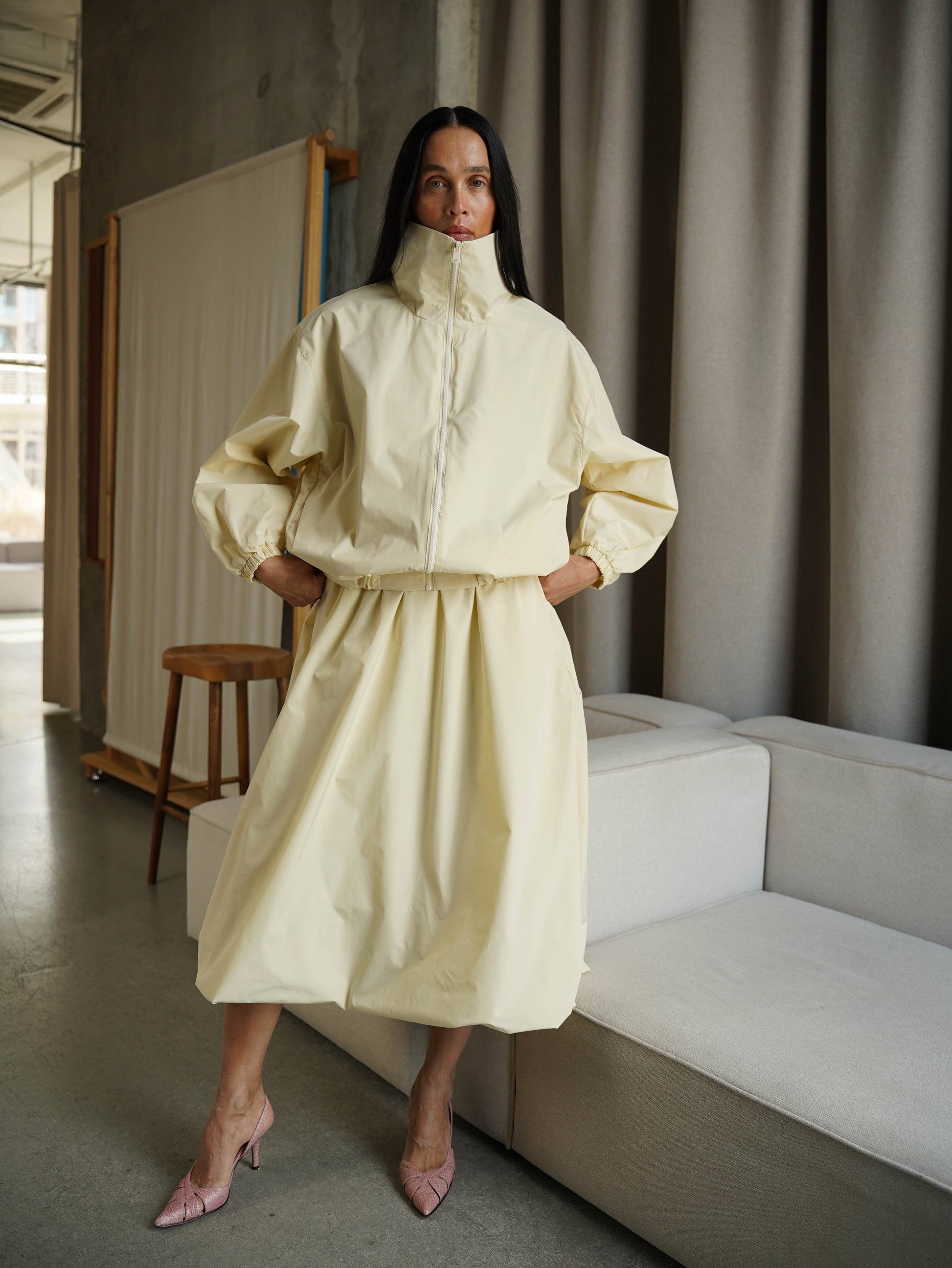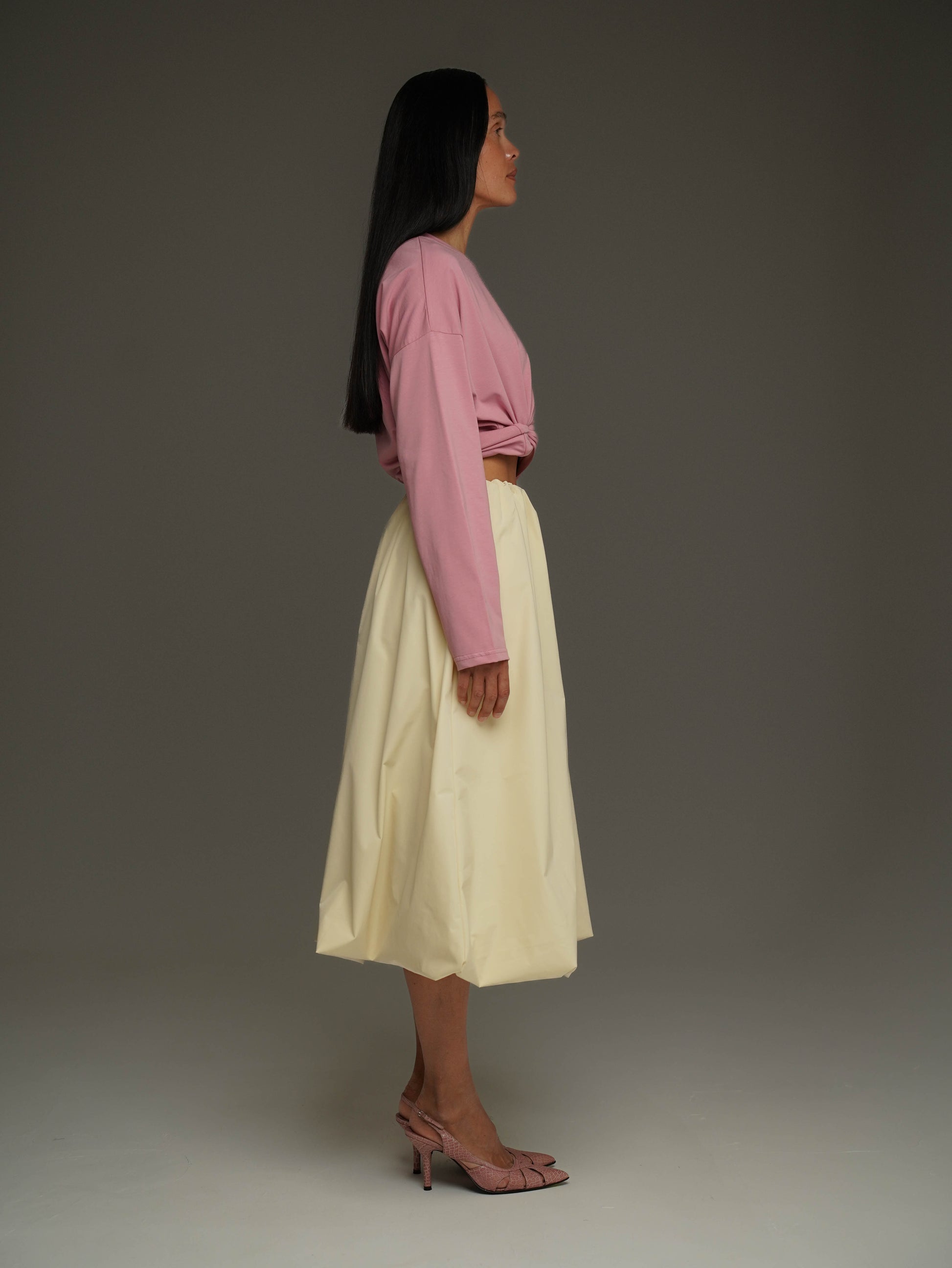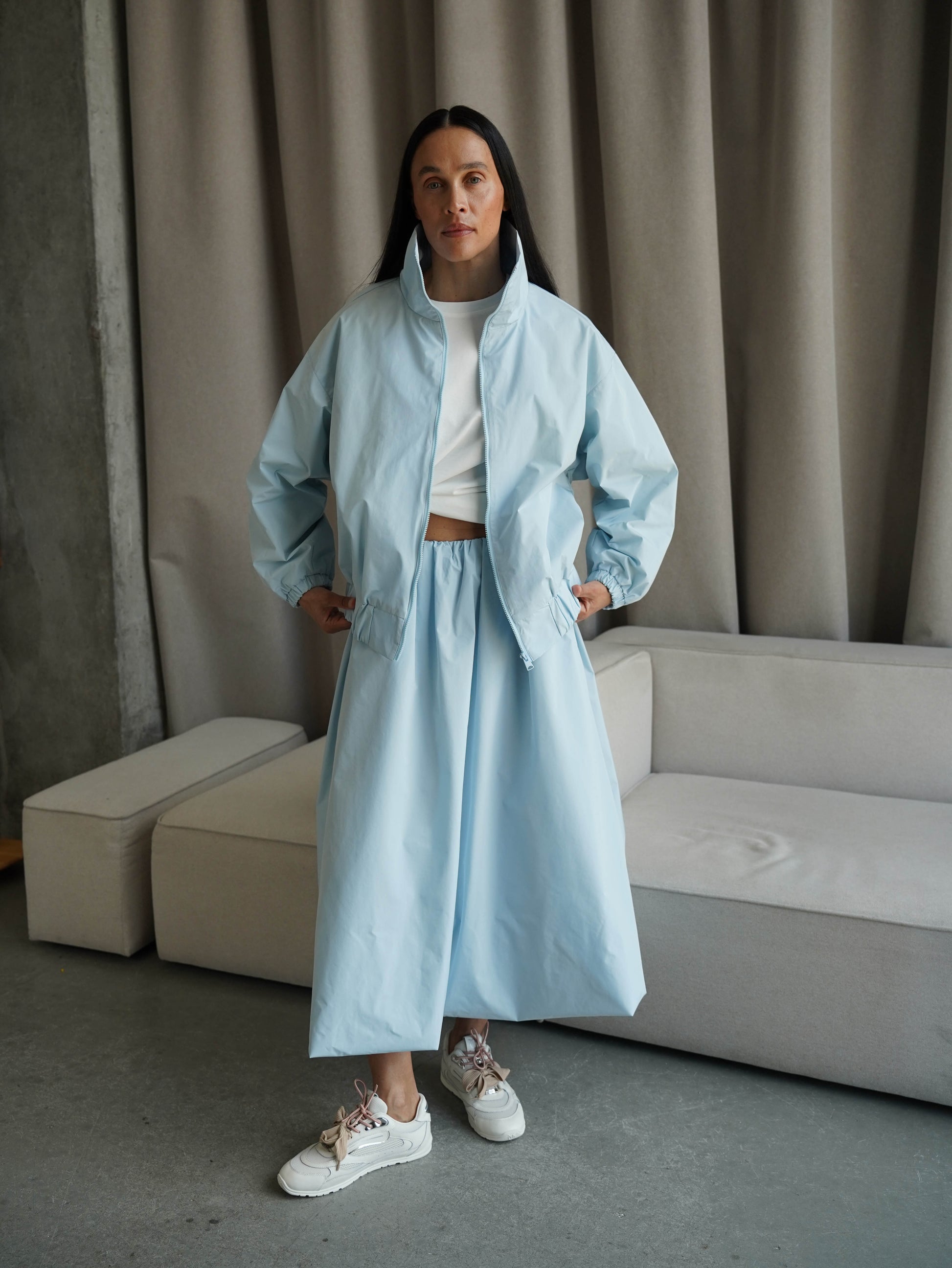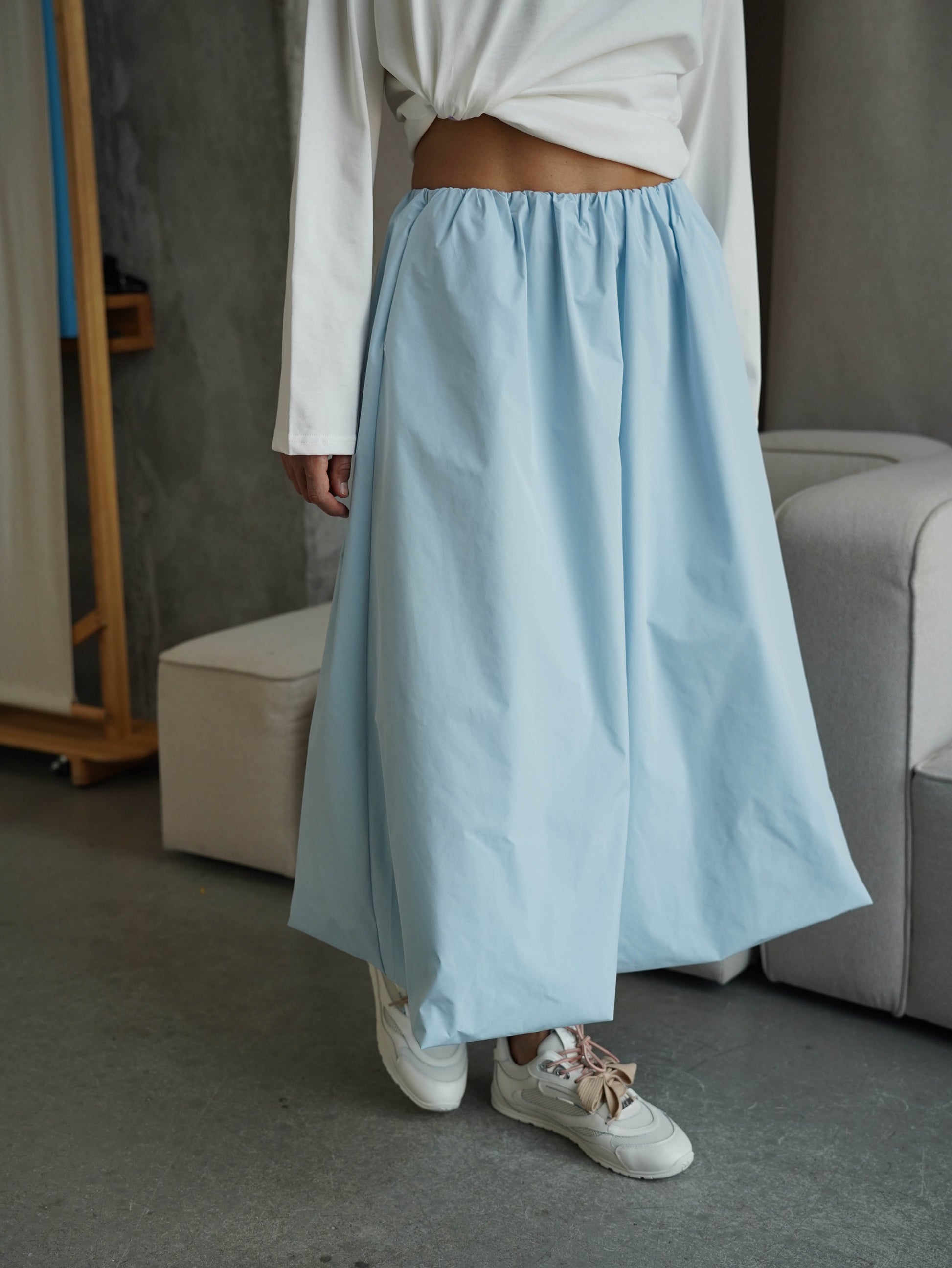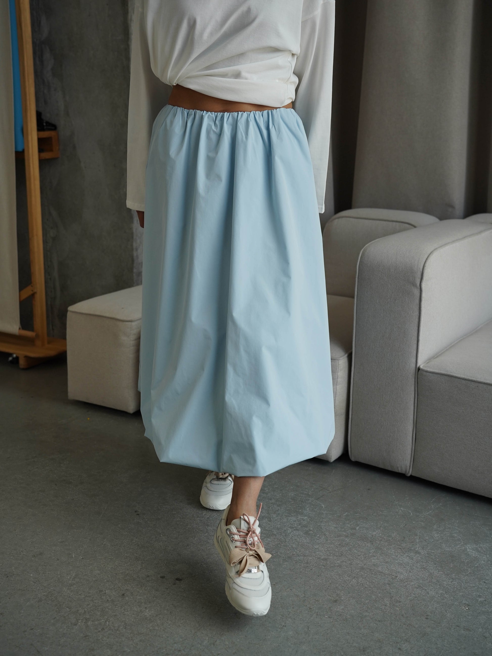 Легка та об’ємна спідниця-балон міді довжини з плащової тканини – ідеальний вибір для будь-якого гардеробу. Резинка на талії формує комфортну посадку, а дві кишені додають практичності.